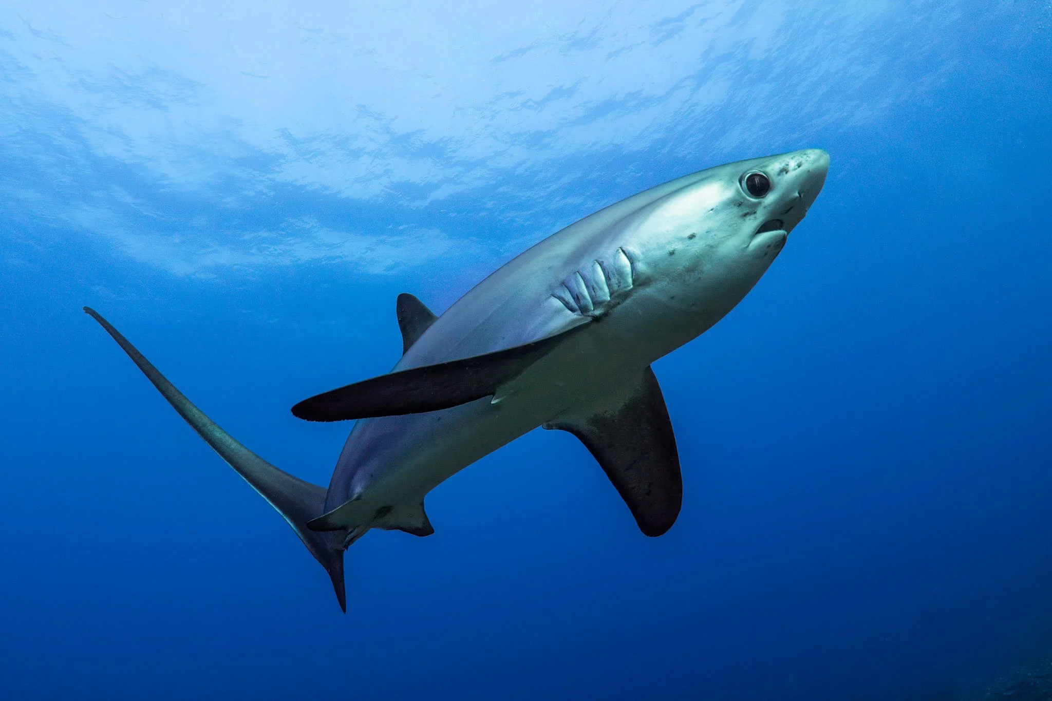 Divers jump in the water early in the morning to wait for the Thresher sharks to appear. Encounters with the Thresher sharks happen at all points of Kimud shoal, and the calmest, quietest divers normally get the closest encounters!